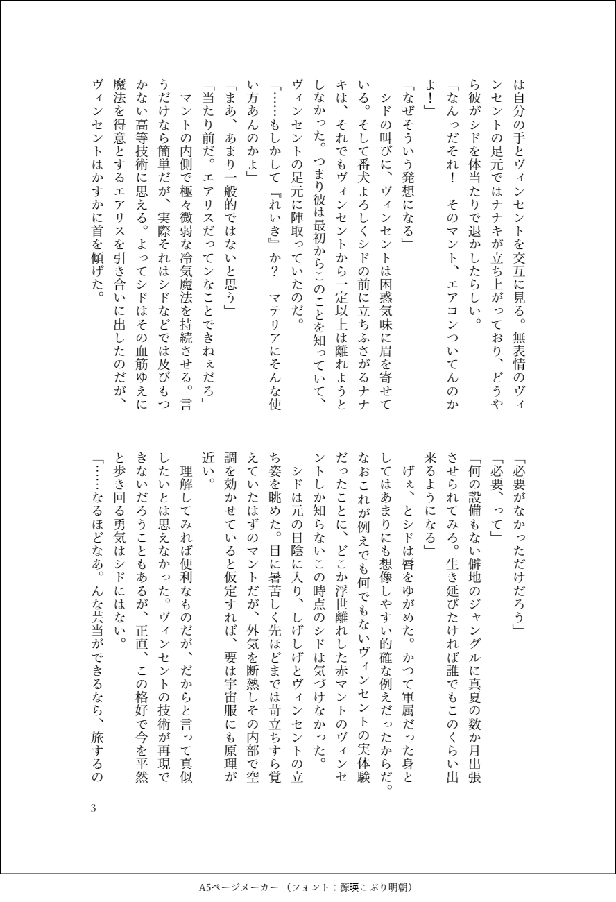 ヴィンセントが気温を感じるか否かというのを引き続き考えていて、ほかの話も加味した結果、”感じるけど対策済みであり、感じないと言い張っている”ことになりました。ヴィンセントが実際に「あまり感じない」と発言しているのは『お祭りデートのすゝめ』ですね。